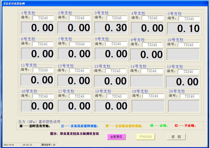 1、每個試驗架位安裝一個檢測儀,能夠實時顯示被試支柱的壓力數(shù)據(jù),自動判別支柱是否合格。